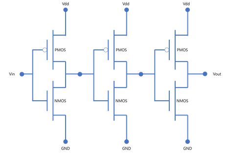 invertor는 입력에 따른 출력이 반전이 되는 소자입니다. 만약 이 반전이 되는 속도가 알고 싶다면 어떻게 측정을 해야 할까요? Vin에 1을 넣으면 바로 0이 되어 버리기 때문에 측정을 할 수가 없습니다. 너무 나도 빠른 속도 때문입니다. 이를 측정하기 위해서는 이 invertor을 여러 개 연결하여 0과 1이 반복시켜 우리가 측정할 수 있는 속도까지 낮추면 됩니다. 바로 아래 그림이 3개의 invertor를 연결한 예시입니다.