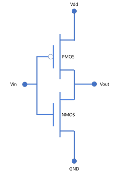 인버터는 N-MOSFET과 P-MOSFET의 조합으로 구성되어 있습니다. 이후 NMOS, PMOS로 표기하겠습니다. 아래 그림이 바로 가장 기본적인 인버터의 모습입니다.